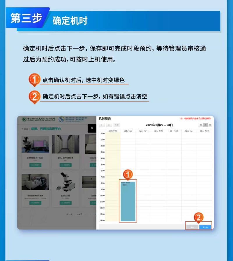 3.设备预约和审核流程:(1)前置要求:需先完成个人注册,方可进行仪器预约。(2)登录设施官网,点击“仪器预约”进入对应界面;输入仪器名称检索,找到目标设备后,点击设备下方的“预约”按钮;选择所需预约时段,点击“保存”即可完成预约。(3)资质核验与机时分配:设备管理员2个工作日内核验预约并确认预约申请;如紧急使用,可电话或有邮件联系设备管理员。设备操作分为自行操作及委托设备管理/技术员操作两种核心模式。自行操作用户需进行操作培训后方可自行操作。(4)设施委托服务项目由项目负责人进行项目实施涉及的设备预约。