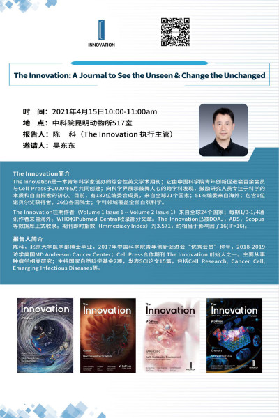 2021年4月15日上午10点The Innovation 杂志主编陈科来所交流,会议地点为茨坝园区517会议室,邀请人:吴东东研究员,欢迎前往交流学习!