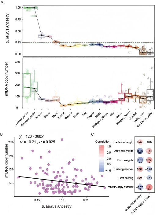 中国科学院昆明动物所张亚平院士团队联合国内外畜牧研究团队选取家牛杂交育种中广泛采用的普通牛(taurine,别称黄牛, Bos taurus)和瘤牛(zebu,也称高峰牛,B. indicus)杂交体系为研究对象,以核质互作为切入视角,分析了近1000 份家牛基因组数据,揭示了杂交群体中mtDNA与核基因组相互作用的动态规律。在非洲杂交家牛群体中,mtDNA全部来自普通牛;核基因组则主要来自瘤牛,表现为明显的mtDNA与核基因组不匹配(mitonuclear DNA discordance)。结果显示,选择作用不断清除非洲家牛核基因组中的普通牛组分,增加了mtDNA与核基因组之间不匹配程度,减弱核质互作,可能对线粒体的组装与功能产生不利影响。同时,选择作用通过富集瘤牛组分,影响线粒体相关的基因表达,提升线粒体拷贝数,改善线粒体功能,缓解和补偿削弱的线粒体-细胞核相互作用(图1)。该研究提出了核质互作进化中通过改变线粒体数量的新型核基因补偿机制,表明mtDNA拷贝数可以作为预测杂交优势或劣势的新型分子标记(图2)。