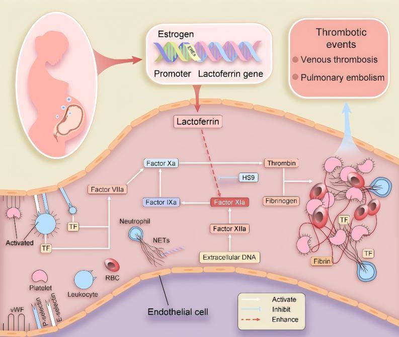 在雌激素的调控下,围产期乳铁蛋白水平的急剧升高介导了母体复杂的多维度适应性反应。该蛋白一方面为幼体生长发育提供关键营养支持,另一方面赋予母体强化的止血保护功能。但与此同时,其对凝血级联的激活效应也不可避免地提升了血栓形成风险。这种哺乳适应性策略与凝血稳态之间的动态平衡博弈,既深刻反映了母体在分娩关键期面临的生理权衡机制,也为解析围产期出血-血栓调控机理提供了新的生物学视角。
