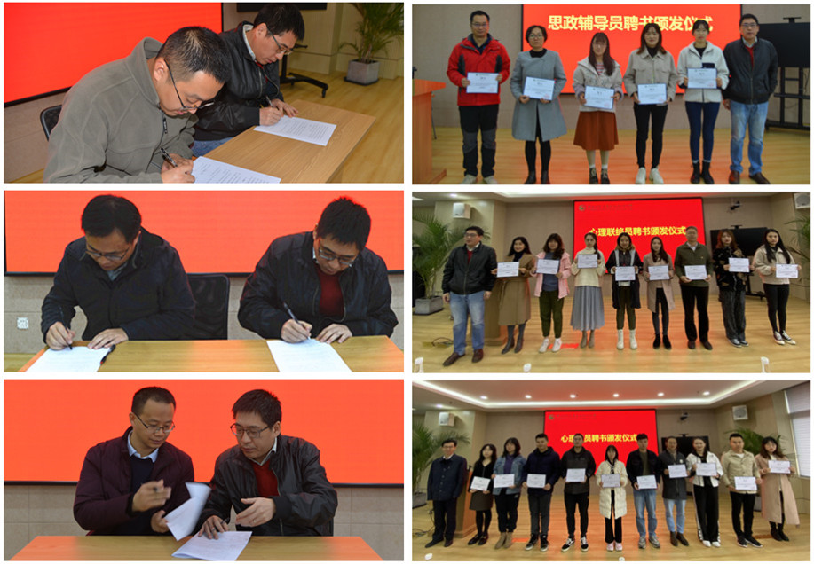 报告结束后,施鹏与导师代表签订了思想政治工作责任书,并为思政辅导员、心理联络员颁发聘书,王雨华为心理委员颁发聘书。