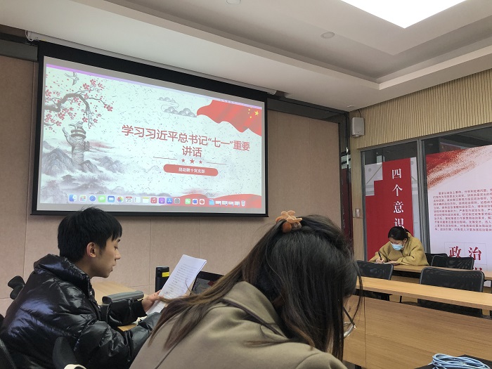 首先,支部副书记廖祉亦作《学习习近平总书记“七一”重要讲话》专题党课,带领支部同志们重温了我党在四个阶段所取得的伟大成就,并强调了十九大对党员提出的新要求:广大党员更应顺势而为,因时而变,积极承担起新职责和新任务,紧密团结在以习近平同志为核心的党中央周围,立足本职,勤勉作为。