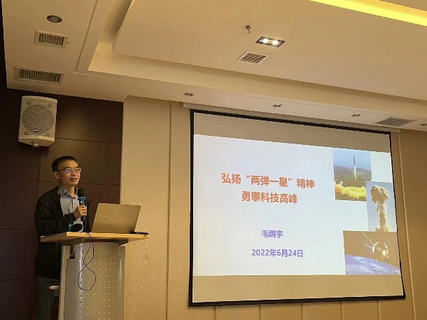 接着,纪委委员、副所长毛炳宇同志作《弘扬“两弹一星”精神勇攀科技高峰》主题党课。毛炳宇同志通过介绍两弹一星的研制背景及其发展历程中的功勋人物,具体阐述“两弹一星”精神内涵,号召全体党员应要继承好发扬好宝贵的精神财富,更好地肩负起科教兴国和创新驱动发展的历史重任。毛炳宇同志同时强调,回顾两弹一星的光辉业绩,不仅表达敬意,而且要从前辈的拼搏奋斗中获得精神的养料和前行的动力,响应时代召唤,勇担时代使命,在为实现中华民族伟大复兴中国梦的奋斗中,创造新的辉煌。