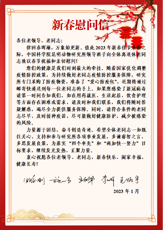 1月12-19日,为做好“乙管乙类”形势下离退休老同志的健康服务保障工作,结合实际情况,在新春佳节来临之际,中国科学院昆明动物研究所所领导、部分管理及支撑部门负责人、工会干部代表全所职工分组电话慰问了生活困难党员、老党员、院士、老干部和老专家等50余名离退休干部,向他们致以诚挚问候和新春祝福。