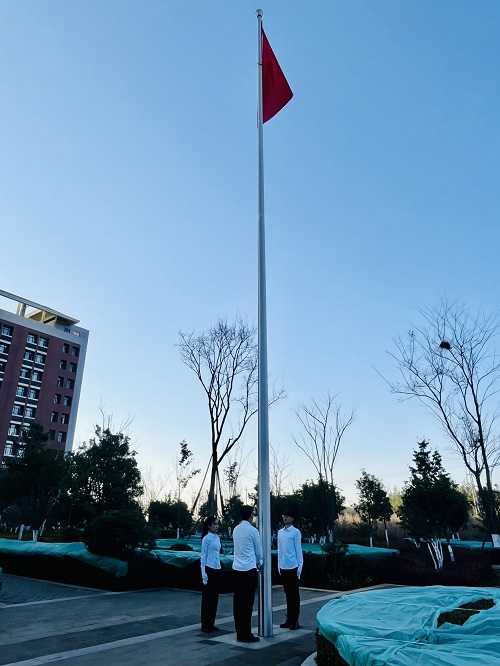 8时30分,升国旗仪式正式开始。伴随着雄壮激昂的《义勇军进行曲》,擎旗手挥臂扬旗,鲜艳的五星红旗冉冉升起。全体人员面向国旗肃然而立,高唱国歌,表达对伟大祖国最崇高的敬意和最美好的祝愿。