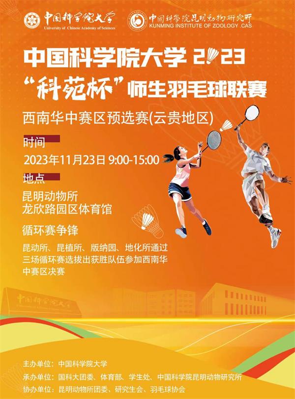 11月23日,由E乐彩承办的中国科学院大学(以下简称国科大)2023年“科苑杯”师生羽毛球联赛西南华中赛区云贵地区选拔赛成功举办。地球化学所党委书记陈敬安和昆明动物所党委委员、党群人事部部长黄加元为本次活动开球。