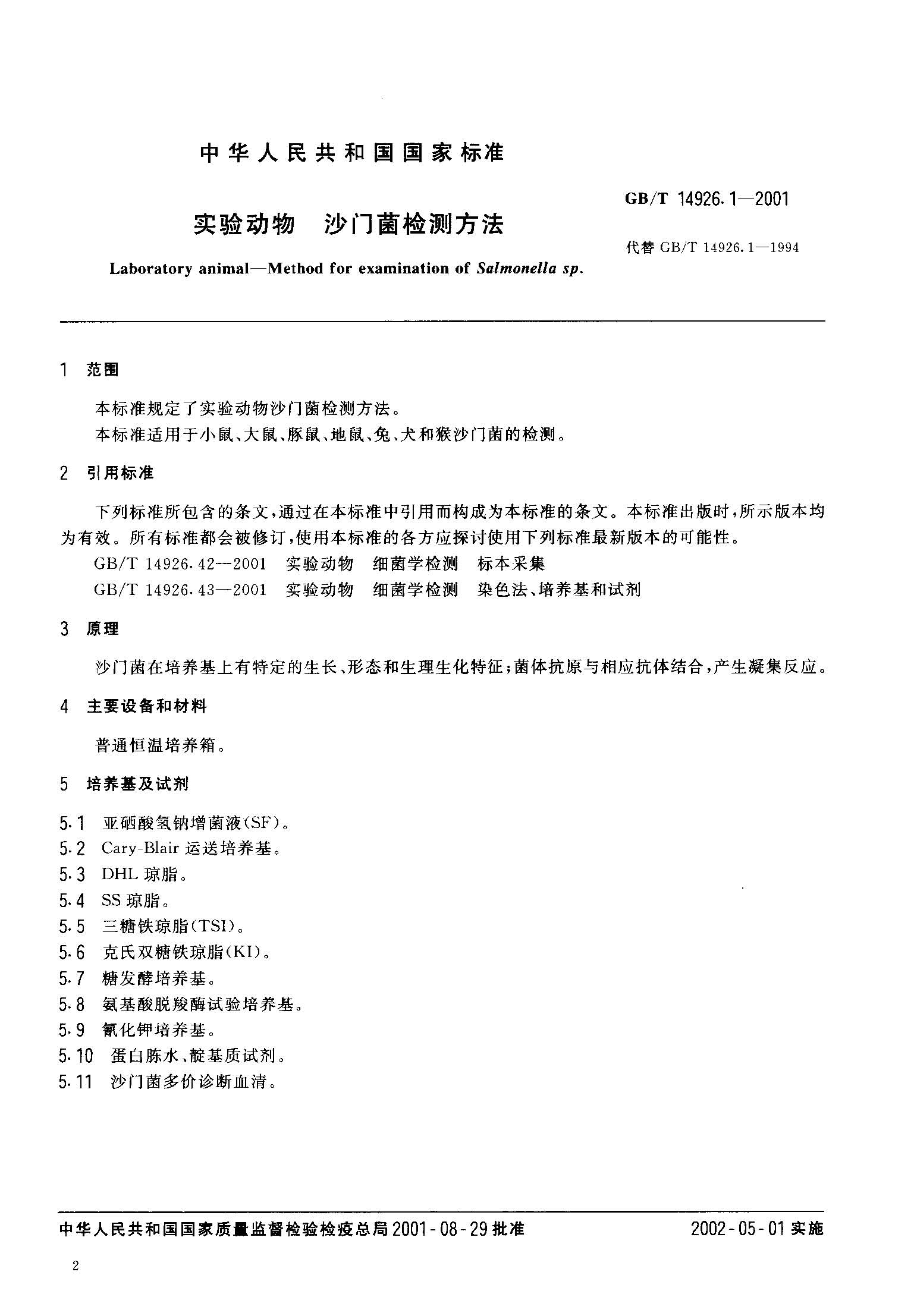 GBT 14926.1-2001实验动物 沙门菌检测方法.pdf
