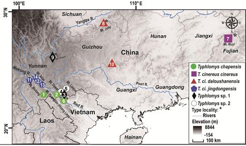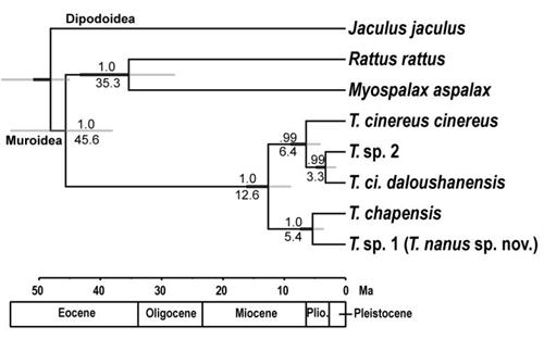 为厘清猪尾鼠属物种与亚种间的系统发育关系与分类地位,我们对近年来在不同区域采集的27号标本进行了研究。结果显示,分子界定形成的5个支系均已达到物种水平,其中采自云南轿子山3号标本和大围山1号标本单独聚成一支,且在形态明显区别于其它支系,而将其描记为一新物种Typhlomys nanus,模式产地:云南轿子山;原大娄山亚种提升为大娄山种Typhlomys daloushanensis;原为猪尾鼠景东亚种Typhlomys cinereus jingdongensis应为沙巴猪尾鼠Typhlomys chapensis的亚种,即:Typhlomys chapensis jingdongensis;两号分别来自云南大围山和老君山的标本很可能为隐存种。研究结果进一步说明猪尾鼠物种多样性显著被低估。此外,研究还发现沙巴猪尾鼠的IRBP基因编码区出现了单个碱基的缺失,可能预示着猪尾鼠视觉现了退化,但仍需要进一步证实。