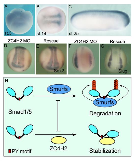 ZC4H2是一个非常保守的小核蛋白,与人类神经系统相关疾病的发生密切相关,但关于其在神经系统发育中的功能一直未知。神经发育与进化学科组的研究发现:在非洲爪蛙的胚胎发育过程中,ZC4H2是一个母源性表达的基因,随后在发育中的神经系统中特异表达。功能实验表明,ZC4H2参与了非洲爪蛙早期胚胎神经诱导过程;且体内和体外的实验都证明ZC4H2可以正调控BMP信号通路。进一步的生化实验表明,ZC4H2通过直接与Smad1/5蛋白相互作用,竞争性抑制了其与泛素连接酶Smurf1/2的结合,从而抑制了Smad1/5蛋白的泛素化降解途径进而促进了其蛋白稳定性。另外在对人类神经系统相关疾病中鉴定出的ZC4H2的突变的研究发现,ZC4H2可能是通过对BMP信号通路的调控参与了人类神经系统的发育过程。