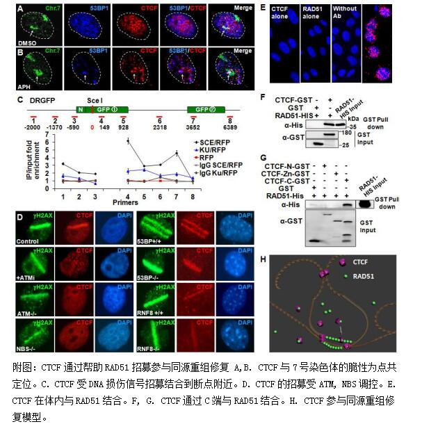 为了寻找一个对这些现象最简单的解释,我们研究了CTCF在维持基因组稳定性和DNA损伤修复中可能发挥的作用。我们发现CTCF缺陷细胞存在更多的染色质断裂、染色质末端融合。CTCF敲低的细胞经过DNA损伤诱导药物处理或UV照射后会产生更多的γH2A.X和53BP1颗粒(A,B),同时导致DDR关键因子ATM活化。激光损伤和ChIP实验发现CTCF可以被招募到DNA损伤区域,这一招募依赖于ATM、NBS和CTCF DNA结合域(C, D)。我们进一步使用针对HR和NHEJ设计的两个DSB诱导修复系统证实CTCF的敲低会引起HR损伤修复效率降低。CTCF与HR途径中关键因子RAD51有直接相互作用(E, F, G),CTCF敲低影响RAD51的招募。我们推测CTCF和RAD51一起促进同源序列的识别,而增加DNA修复效率(H)。这些证据表明CTCF确实参与了维持基因组稳定性和DNA损伤修复过程。这一发现将引导我们对已发表的许多研究进行重新解释,也为我们从染色质高级结构组织层面研究基因组稳定性维持打开了新的视角。