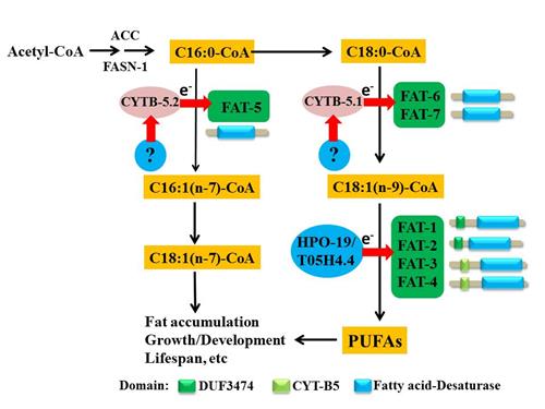 模式生物秀丽线虫有7个去饱和酶,分别是FAT-1 至FAT-7,参与合成如油酸(OA)、花生四烯酸(AA)、DHA和EPA等所有不饱和脂肪酸。因此,秀丽线虫是研究不饱和脂肪酸合成和调控的极佳动物模型。前期,梁斌实验室(张玉茹博士和张静静博士等)揭示,FAT-1,2,3和4蛋白都具有一个细胞色素b5的结构域和一个去饱和酶结构域,电子经过细胞色素b5还原酶HPO-19/T05H4.4交给这些去饱和酶,合成多聚不饱和脂肪酸(BBA-Molecular and Cell Biology of Lipids, 2016)。