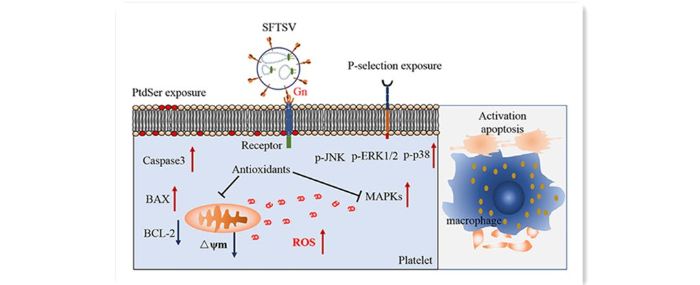 血小板减少症是SFTS的主要标志,与发病的严重程度显著相关,但是SFTSV感染导致血小板减少的精确分子机制仍不清楚。郑永唐研究员团队对SFTSV引起血小板减少的机制以及治疗进行探索。首先研究团队发现SFTSV诱导的血小板清除速率增加是血小板减少的主要原因。随后通过体外实验和小鼠动物模型体内实验,发现SFTSV和病毒糖蛋白N(Gn)引起血小板活性氧(ROS)过度产生、线粒体功能障碍;以ROS-MAPK依赖方式导致血小板活化和凋亡是导致SFTSV感染致血小板减少和出血事件的重要机制;抗氧化剂NAC(N-乙酰-L-半胱氨酸)、SKQ1和白藜芦醇可通过抑制ROS的过量产生,改善线粒体功能障碍,下调血小板活化和凋亡。因此,抗氧化剂可用于SFTSV感染诱导的血小板减少症。该研究论文“Severe fever with thrombocytopenia syndrome virus induces platelet activation and apoptosis via a reactive oxygen species-dependent pathway”近日发表于国际知名学术期刊《Redox Biology》(2023, Aug 1; 65:102837. DOI: 10.1016/ j.redox.2023.102837)。E乐彩李艺辉博士研究生为本文第一作者,郑永唐研究员为通讯作者。以上研究获得国家重点研发专项、国家自然科学基金、云南省重大专项等项目资助。