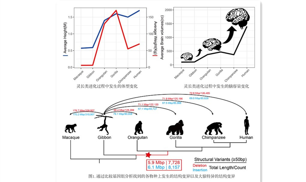 研究包括我们人类在内的大猿物种的独特表型及其遗传基础是了解人类起源和进化的重要方面。现存大猿(great-ape)物种主要包括红毛猩猩(Orangutan)、大猩猩(Gorilla)、黑猩猩(Chimpanzee)、倭黑猩猩(Bonobo)和人类(Human)。相比于小猿(lesser ape),如长臂猿(Gibbon)等,大猿物种有着更大的体型、更大的脑容量以及更高的认知能力,这些创新表型使大猿成为灵长类中进化非常成功的一支。然而,关于这些大猿创新表型的遗传基础目前知之甚少,特别是大尺度的基因组结构变异。