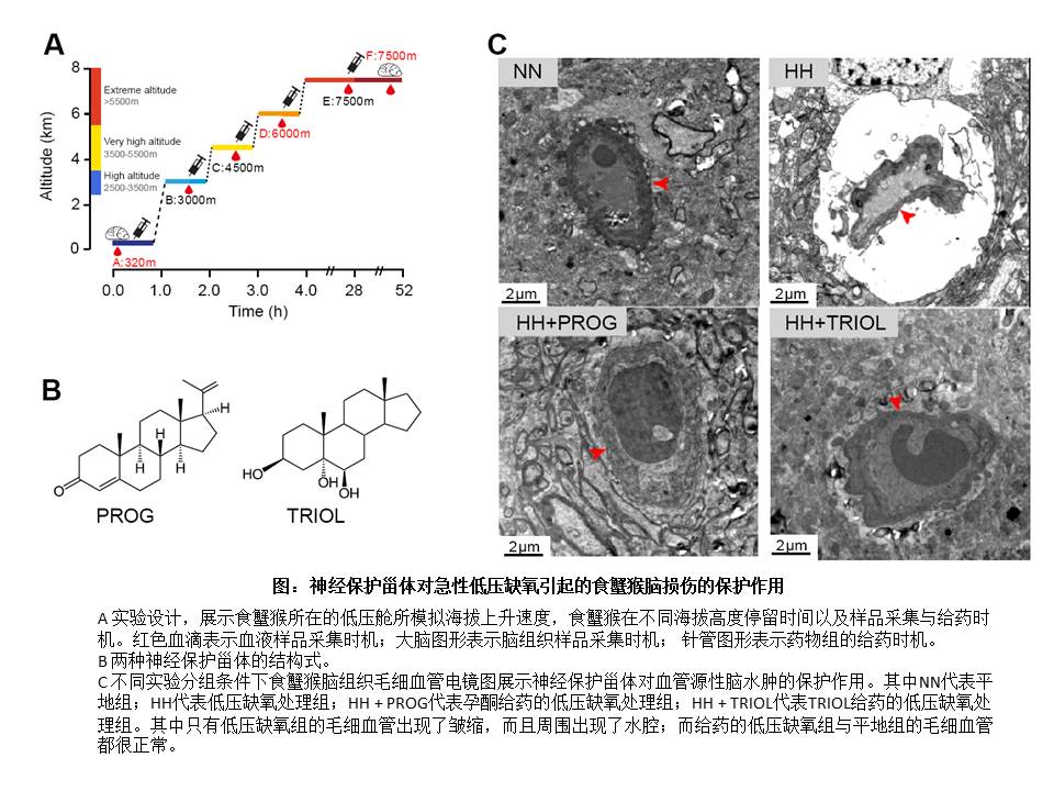 高原是地球上最恶劣的环境之一,最主要的特点是低气压所导致的缺氧。急性暴露在低压缺氧环境下,未习服人群会出现脑损伤,在严重情况下甚至会发展成为致命性的高原脑水肿。在我国,大约25%的陆地是海拔高度超过3000米的高海拔区域,并且集中在青藏高原区域,这严重阻碍了当地的基础设施建设、扶贫、经济开发和国防建设。高原疾病的发病机制复杂,尽管很多关于高原疾病的假说被提出,其具体病理机制依然未被充分阐明,妨碍了高原相关疾病药物的研发。目前主要有两类药物用来防治急性高原病,包括刺激呼吸的碳酸酐酶抑制乙酰唑胺和抗炎的糖皮质激素类可的松,但是这两种药物都有较多的副作用。同时,应用一些遗传背景和人类差异较大的动物研究高原相关疾病,这也可能是制约高原病基础研究以及药物研发的原因之一。