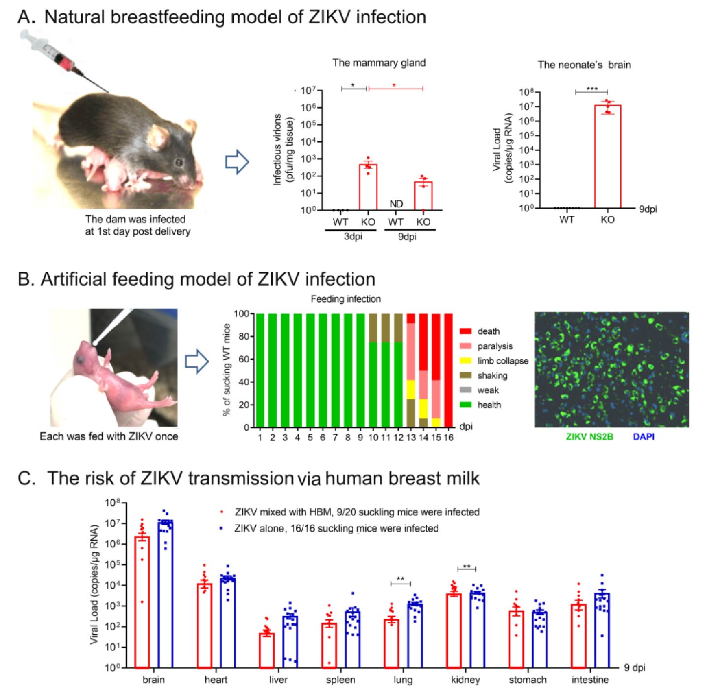 图1.小鼠模型研究证实哺乳可传播寨卡病毒。A.在自然哺乳模型中,ZIKV可以通过母乳感染A129乳鼠;B.在人工哺乳模型中,C57Bl6乳鼠饲喂ZIKV可被感染并致神经系统病征;C.人乳汁具有一定抗病毒活性但不能阻断ZIKV可感染C57Bl6乳鼠。