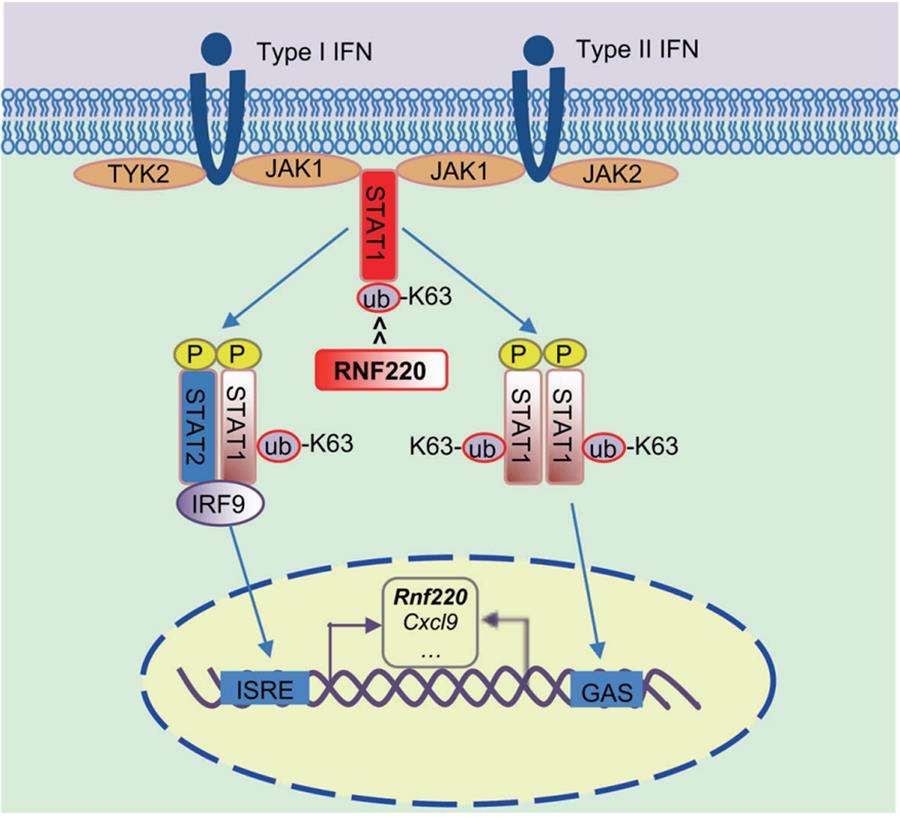 图示RNF220正反馈调控IFN-STAT1信号通路激活的分子机制