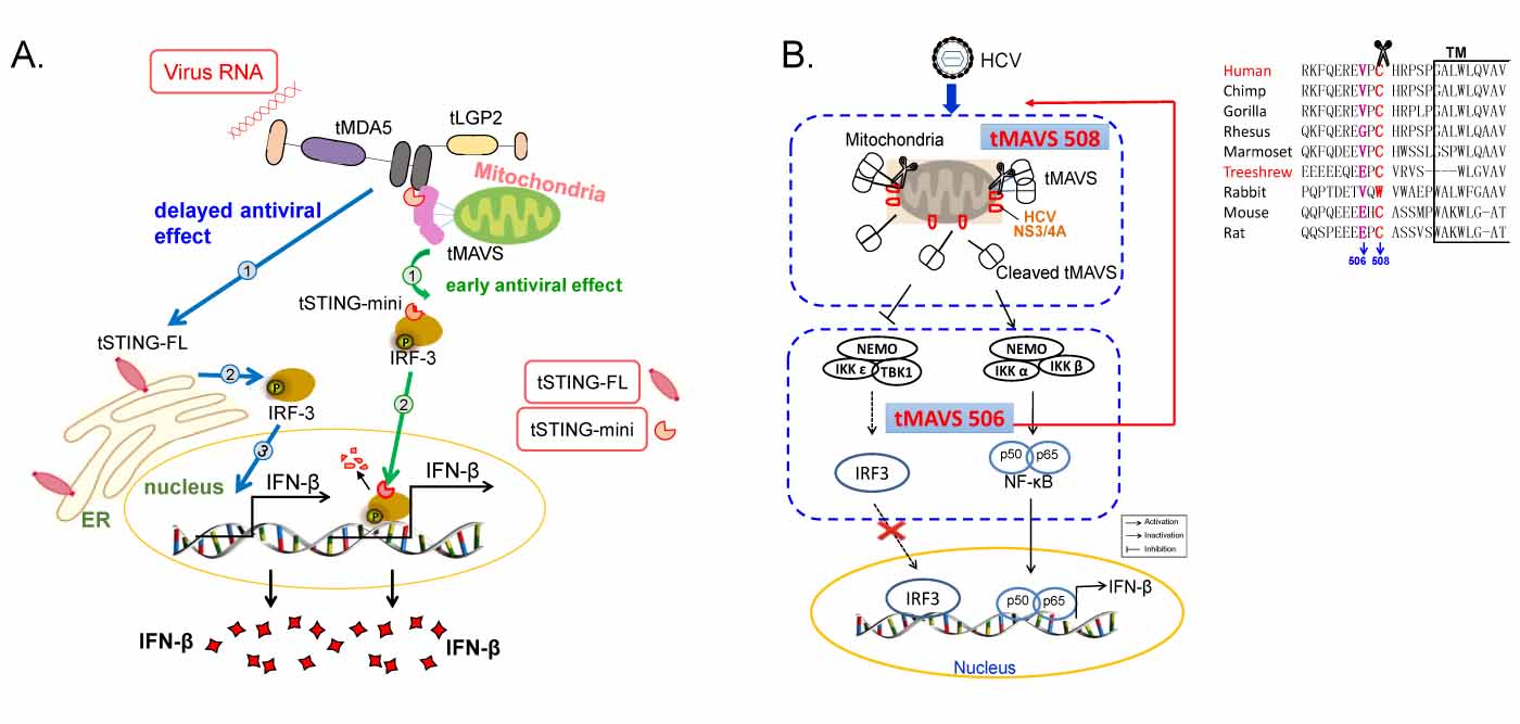 在另一项研究中,我们关注在丙型肝炎病毒(hepatitis C virus,HCV)感染过程中,影响感染高度种属特异性的线粒体抗病毒信号蛋白(MAVS)基因。该基因和RIG-I / STING等位于同一通路。树鼩可感染HCV,但整体上HCV感染率低,极少形成持续性感染,其原因尚未明确。在人肝细胞中,HCV感染后,其编码的丝氨酸蛋白激酶NS3/4A会在第508位氨基酸位置上切割人MAVS蛋白(hMAVS),从而逃逸MAVS介导的宿主抗病毒的先天免疫应答反应,实现病毒增殖。我们前期研究发现,树鼩MAVS(tMAVS)在结构和功能方面和人MAVS具有一定的保守性(Dev Comp Immunol 2015)。HCV感染树鼩原代肝细胞后,病毒可以复制。HCV NS3/4A可与tMAVS共定位,并识别其第508位保守的半胱氨酸,进而切割tMAVS。tMAVS蛋白的第506位氨基酸残基是谷氨酸,虽然不是hMAVS中的缬氨酸,但仍可支持NS3/4A切割tMAVS。NS3/4A对tMAVS切割后,可抑制下游IRF3介导的干扰素β的产生,但不影响NF-κB信号通路的激活状态。该发现从病毒逃避宿主天然免疫的角度,揭示了树鼩易感HCV却难以形成持续性感染的原因。研究结果于9月9号以“Tupaia MAVS is a dual target during HCV infection for innate immune evasion and viral replication via NF-κB”为题,发表在Journal of Immunology。姚永刚课题组的许凌博士和余丹丹为该论文的共同第一作者,姚永刚研究员为通讯作者。