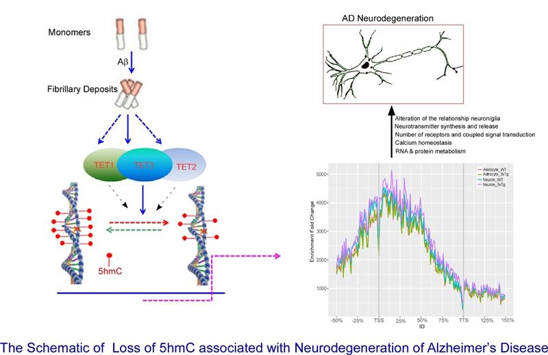 阿尔茨海默病(Alzheimer disease ,AD)是一种与衰老密切相关而复杂的多因素疾病,其发病机理十分复杂。AD主要的神经病理特征为β-淀粉样蛋白沉积形成斑块及微管蛋白tau过度磷酸化形成神经纤维缠结。尽管之前的AD病人脑组织样本和模型小鼠研究已经报道,在AD神经元退行性病变过程中存在着明显的表观调控改变和功能失调,这其中就包括:DNA甲基化和去甲基化。 作为机体重要的表观调控系统,DNA甲基化和去甲基化参与诸多生物学过程, 同时,也与许多疾病发生发展密切相关。 但是,发生在AD神经元退行性病变中的DNA甲基化和去甲基化异常改变的特征如何? 以及其是否参与和影响AD神经元退行性病变?