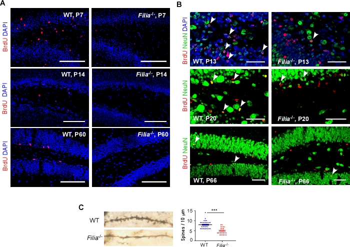 和胚胎干细胞比较,组织干细胞仅具备组织特异的发育潜能。但它们是否在基因组稳定性维持上存在一些共同调控机制?为了探究这一问题,我们在小鼠神经干/祖细胞(neural stem/progenitor cells,NSPCs)中对Filia的表达和功能进行了研究。有趣的是,Filia仅特异表达在出生后的小鼠海马NSPCs中。功能研究发现,Filia调控海马NSPCs的基因组稳定。海马区Filia缺失后,产生严重的DNA双链断裂及异常的神经发生。行为学实验进一步表明,海马相关的神经功能受损,小鼠表现出学习和空间记忆能力下降、焦虑。为了进一步理解基因组不稳定如何导致神经发生及功能异常,我们利用高通量全基因组易位测序技术(high-throughput genome-wide translocation sequencing, HTGTS),对Filia缺失诱导的DNA双链断裂位点进行了定位研究。发现很多调控神经发生和神经功能的基因受到影响,产生了双链断裂热点(hotspots),由此可影响基因功能。最后,我们在猕猴NSPCs中,也发现同源基因在猴NSPCs中具有保守功能,提示人类该基因的功能变异可能导致神经系统发育疾病。