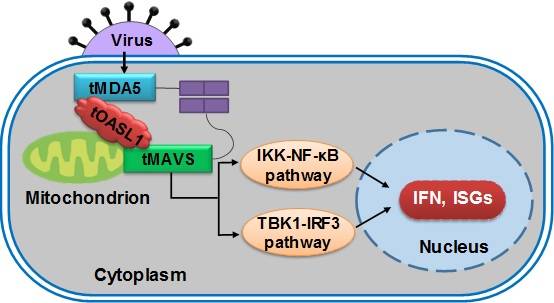 近期,姚永刚课题组集中对树鼩的干扰素刺激基因(interferon stimulated genes,ISGs),2’,5’-寡聚腺苷酸合成酶家族(2’,5’-Oligoadenylate synthetase,OAS)进行了研究。该基因家族是干扰素诱导产生的一类具有抗病毒效应的ISGs,作为胞内的模式识别受体(pattern-recognition receptors),和人类疾病密切相关。我们前期发现,树鼩OAS家族基因(tOASs)有4种家族成员(tOAS1、tOAS2、tOASL1和tOASL2),在抗DNA病毒和RNA病毒复制中均呈现出广谱的抗病毒效应,且tOAS1和tOAS2的抗病毒效应依赖于经典的OAS/RNase L信号通路(Cytokine 2019)。本研究中,我们进一步通过双荧光报告系统筛选发现,tOASL1特异性地正调控RNA病毒诱导的免疫应答反应。过表达tOASL1可以显著促进RNA病毒引起的天然免疫信号通路激活,而敲低或敲除tOASL1则会抑制RNA病毒介导的免疫应答反应。在机制方面,tOASL1与线粒体共定位,可与细胞中免疫因子tMDA5和tMAVS相互作用,并担当“桥梁”的作用,促进tMDA5和tMAVS的相互作用,正反馈调节tMDA5-tMAVS介导的干扰素β的产生。在RNA病毒刺激下,与人OASL与RIG-I相互作用的方式不同,树鼩中RIG-I缺失,但tOASL1与tMDA5和tMAVS相互作用,进而实现抗病毒效应的传递,这种调控作用呈现出tOASL1功能的物种特异性。该研究揭示了树鼩干扰素刺激基因OASL1在调节RNA病毒复制中的重要性,拓展了OASL的免疫反应调控功能的认识。该研究结果以Tupaia OASL1 Promotes Cellular Antiviral Immune Responses by Recruiting MDA5 to MAVS为题发表在Journal of Immunology上。姚永刚课题组的博士研究生姚玉林是该论文的第一作者,姚永刚研究员为通讯作者。该研究工作得到NSFC-云南联合基金项目、中科院和云南省的资助。