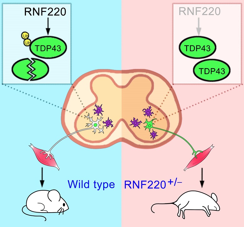 图示RNF220调控脊髓运动神经元TDP43蛋白稳定性及ALS的发生发展