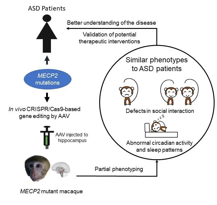 研究者基于AAV病毒介导的CRISPR/Cas9技术,向成年猕猴海马脑区直接注射携带CRISPR/Cas9的腺相关病毒(AAV),直接编辑成年猕猴海马脑区的MECP2基因,发现猕猴可出现一系列类似于孤独症患者核心症状的行为学改变,实现了基因编辑猕猴并在短期内诱导出现疾病表型的研究目的。