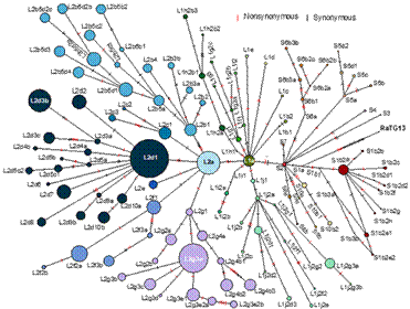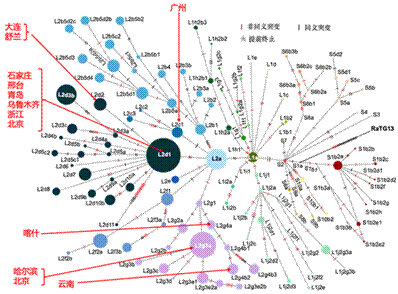 图1. 基于206个分型标记位点的130个亚谱系的单倍型网络