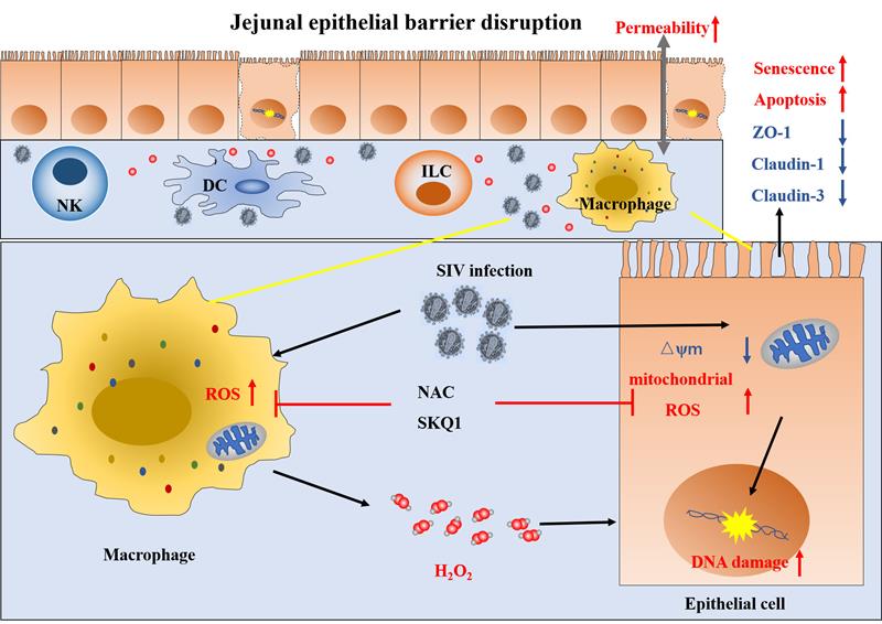 图1. SIVmac239病毒感染急性期猕猴空肠上皮屏障损伤机制示意图