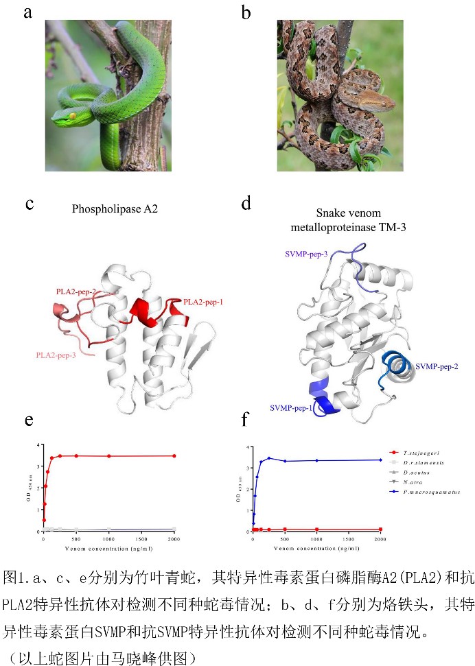 全球至少有768种有毒蛇类。正如前联合国秘书长科菲·安南(Kofi Annan)所说,“毒蛇咬死、咬伤是最重要、也是最被忽视的热带病。” 全球每年被蛇咬伤人数180万-270万人并造成超过12.5万人死亡。我国每年被蛇咬伤人数20万-40万人并造成近万人死亡。此外,相当大比例的蛇伤病人终身残疾,造成严重的家庭负担、是导致农村贫困的重要因素。2017年,世界卫生组织将蛇伤列为全球应当协同起来优先应对的热带疾病(https://www.who.int/teams/control-of-neglected-tropical-diseases)。毒蛇种类的高效和精准判定是蛇伤救治的关键。但是由于蛇毒成分的复杂性和种间蛇毒的高度相似,使蛇伤的及时高效诊断变得非常困难。目前为止几乎没有可靠的蛇毒诊断方法用于属/种特异性鉴定。