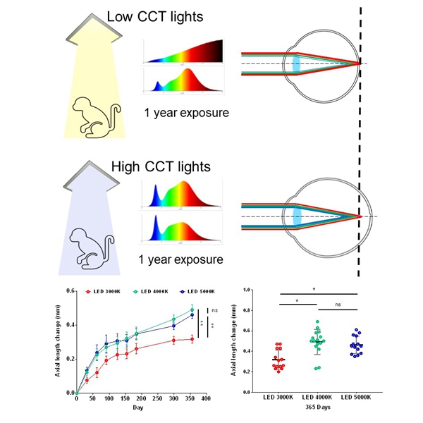 近几十年来,伴随着居住和学习环境中照明条件的巨大改变,近视的发病率迅速增加,这提示光环境可能是近视发生发展的一个重要原因。相关色温(Correlated Color Temperature, CCT)可以在一定程度上反映光源的光谱成分。胡新天课题组使用32只幼猴作为研究对象,采用由不同CCT构成的四种典型光源来研究CCT与眼轴增长之间的关系。在经过365天的观察后,低CCT光照下的猕猴的眼轴增长显著小于高CCT光照下的猕猴的眼轴增长,并且在整个观察期间,这种效应是持续和稳定的。该成果是国内外第一次系统的关于常规照明光源色温与眼轴发育关系的报道。由于眼轴过度增长是青少年近视的主要原因,这些结果有可能为预防青少年近视提供新的手段和方法。