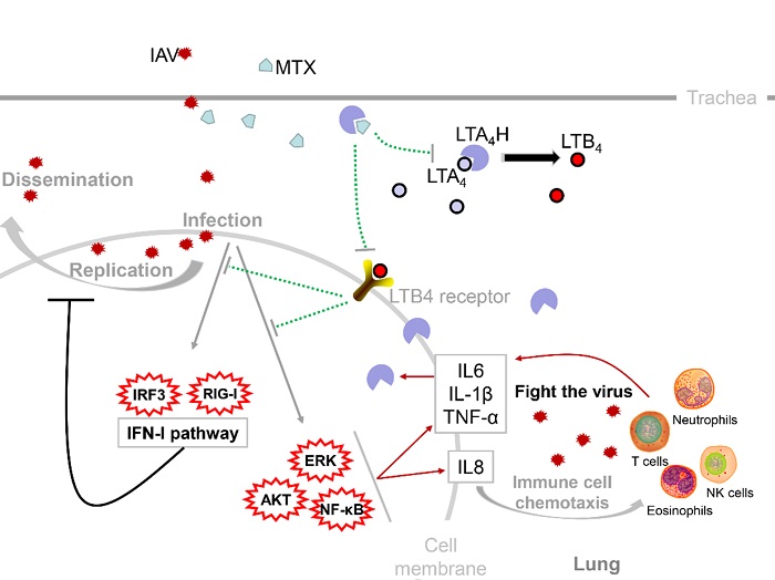 E乐彩赖仞研究员牵头的团队联合陆军军医大学邓国宏教授团队最近从蝙蝠唾液腺中发现一个具有免疫抑制功能的多肽毒素MTX。MTX具有抑制白三烯A4水解酶、胰蛋白酶、纤溶酶和弹性蛋白酶功能,而有抑炎和促炎作用的双功能金属酶——白三烯A4水解酶,对机体的免疫调节尤其重要。在活性检测实验中发现,MTX仅抑制白三烯A4水解酶的促炎产物白三烯B4的生成,而对促炎介质趋化三肽Pro-Gly-Pro的降解没有影响,显示其独特的炎症抑制特征。显示出MTX是蝙蝠局部形成免疫耐受与免疫防御平衡的微环境、使得病毒得以长期驻留的重要因素之一。此外,施用了MTX的细胞和小鼠被证明更容易受到甲型流感病毒的感染,这种易感染的结果与感染初期的炎症因子、抗病毒因子、趋化因子以及免疫细胞趋化数量的降低有关,由于感染的加剧最终导致更严重的细胞和组织损伤。进一步显示出MTX免疫抑制机理的促病毒感染作用,为病毒的水平传播提供可能。