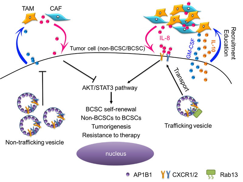 图注.Rab13控制微环境细胞(巨噬细胞TAM和肿瘤相关成纤维细胞CAF)与乳腺癌干细胞(BCSC)的互作。Rab13调控AP1B介导的CXCR1/2运输,激活AKT、STAT3信号通路,进而上调GM-CSF和IL-8。Rab13促进以上正反馈分子环路,促进乳腺癌干细胞干性和耐药性