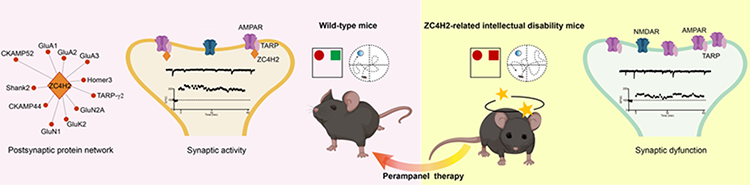 突触是大脑中神经元相互连接的结构和功能基本单元,突触活性紊乱和功能异常则是诸多脑疾病的重要致病机理,包括神经发育障碍和神经退行性疾病。然而,相关脑疾病致病基因引发突触功能异常的分子机制仍不甚清楚,靶向恢复突触活性是否可作为相关脑疾病的干预治疗手段,也有待深入研究。ZC4H2是一个X染色体连锁基因,其编码包含C4H2型结构的锌指蛋白,其基因突变会引发包括智力障碍、发育迟滞、运动障碍和癫痫等临床症状的神经发育障碍,目前此类疾病被称为ZC4H2相关罕见病(ZC4H2 associated rare disorder,ZARD)[1,2]。毛炳宇研究团队团队前期利用非洲爪蟾、斑马鱼和小鼠等动物模型,系统解析了ZC4H2在早期神经系统图式形成、小脑发育和骨骼发育过程中的重要作用与机制[3-7]。另外,虽然有研究提示ZC4H2可以定位到兴奋性神经突触,但其在突触活性和脑功能调节中的作用,以及遗传突变导致相关疾病,特别是智力障碍中的突触病理机制,仍缺乏相关研究。