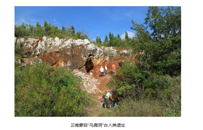 云南蒙自马鹿洞是1989年采石场工人发现的一个早已自然封闭的洞穴,化石及文化遗物经专家鉴定确认为一古人类遗址。遗址位于云南省红河哈尼族彝族自治州蒙自市郊的黄家山山麓。1989年由云南省博物馆、红河州文物管理所和蒙自县文化馆联合组织抢救性发掘,出土了包括头盖骨、下颌骨、股骨在内的30余件人类化石,以及马鹿、猕猴、黑熊等哺乳动物化石。2008年,云南省文物考古研究所等单位系统采集了地层环境样品和测年材料,结果显示整个马鹿洞遗址的年代范围为17,830±240至13,290±125年前,其中头盖骨(MLDG1704)出土的地层年代为约14,000年前。