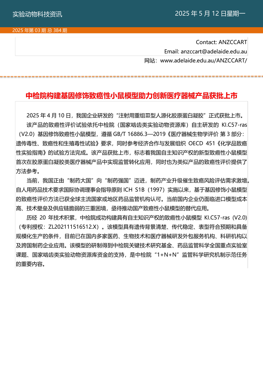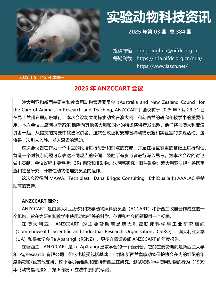 摘要:国家实验动物专家委员会工作活动简报由国家实验动物专家委员会主办,即时报道我国实验动物工作进展、行业发展动态、实验动物专家参与的重大活动等内容。本期主要内容——2025年ANZCCART会议、中检院构建基因修饰致癌性小鼠模型助力创新医疗器械产品获批上市。