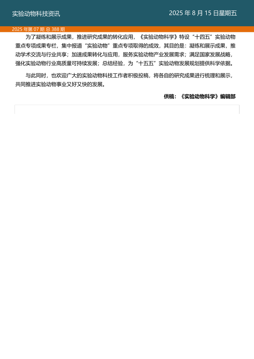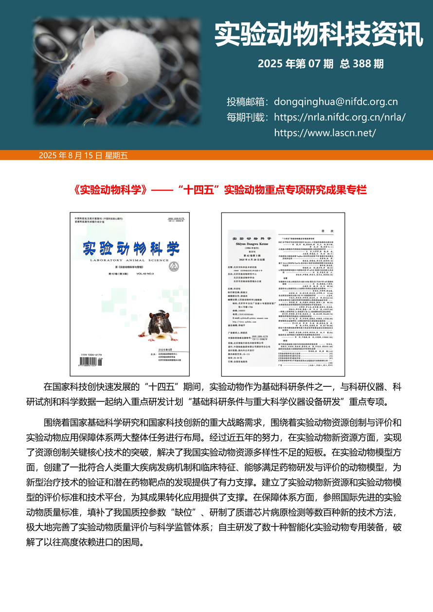 摘要:国家实验动物专家委员会工作活动简报由国家实验动物专家委员会主办,即时报道我国实验动物工作进展、行业发展动态、实验动物专家参与的重大活动等内容。本期主要内容——《实验动物科学》--“十四五”实验动物重点专项研究成果专栏。