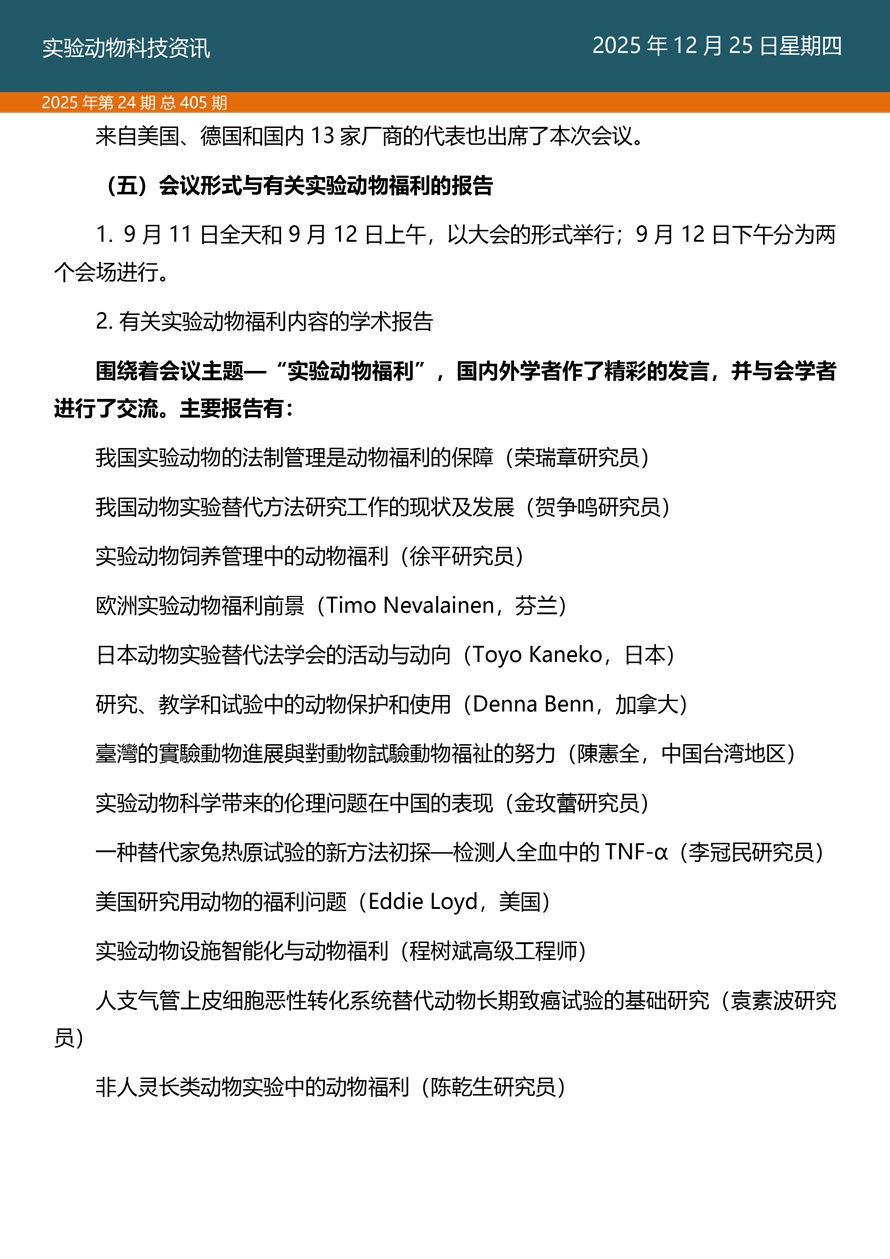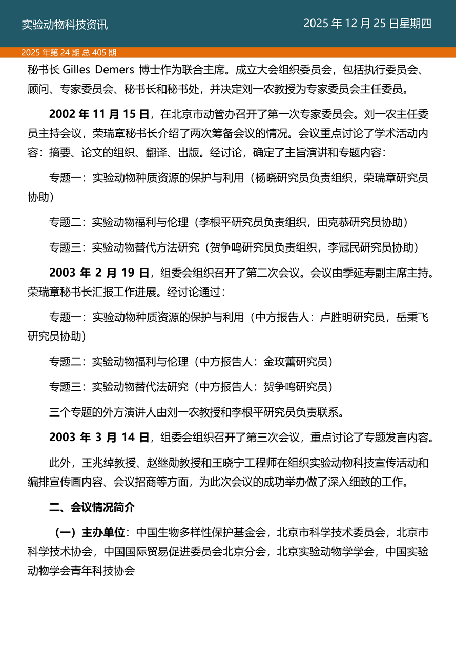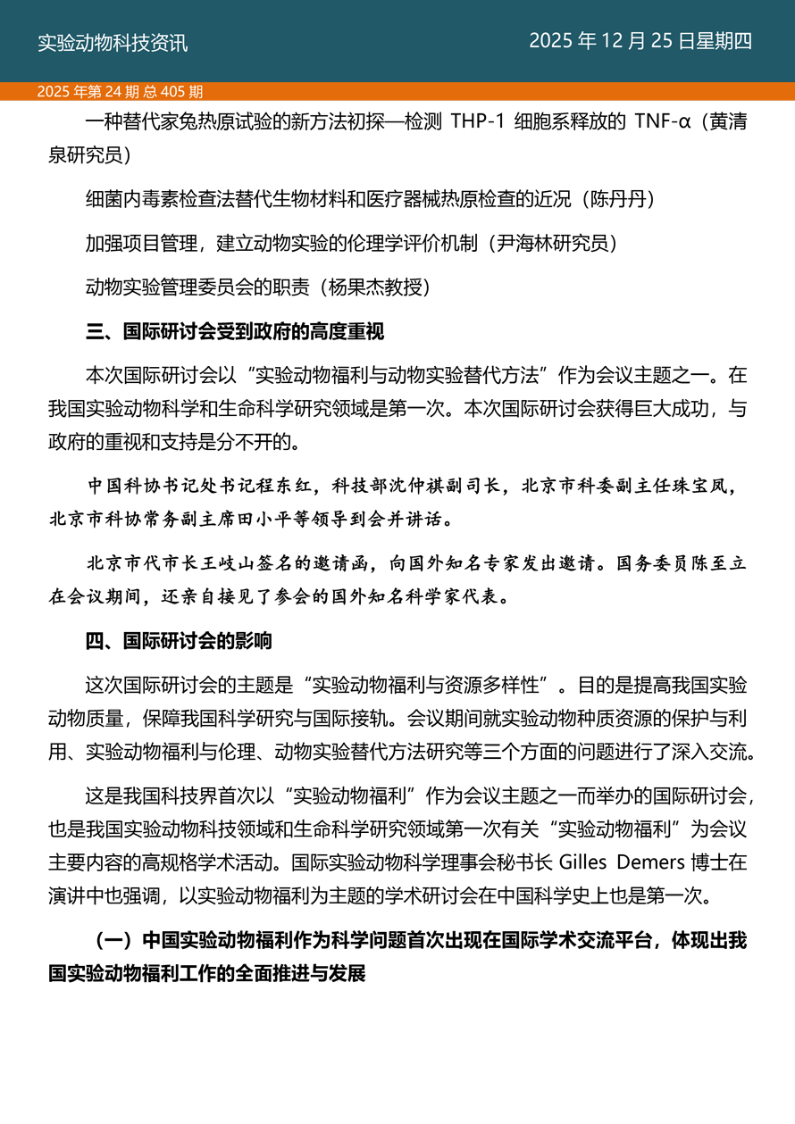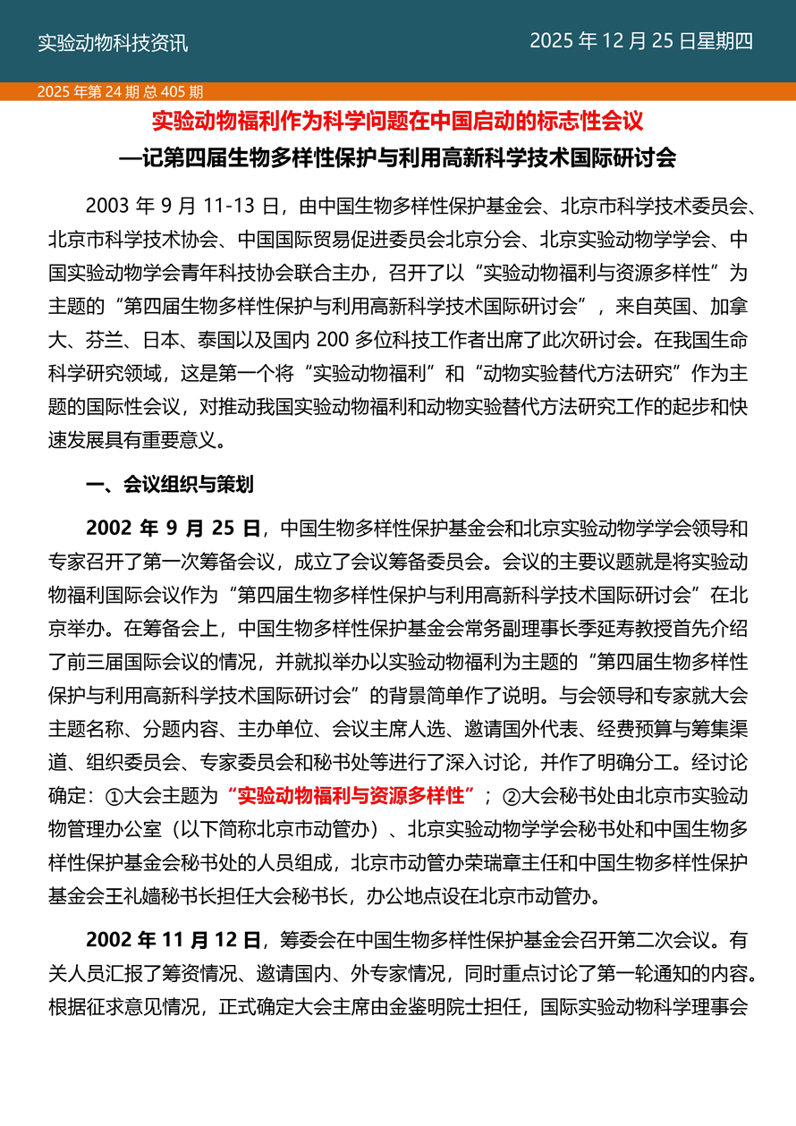 摘要:国家实验动物专家委员会工作活动简报由国家实验动物专家委员会主办,即时报道我国实验动物工作进展、行业发展动态、实验动物专家参与的重大活动等内容。本期主要内容——《探索科技伦理与动物实验革新·资源与工具推介》之十三、实验动物福利作为科学问题在中国启动的标志性会议——记第四届生物多样性保护与利用高新科学技术国际研讨会。