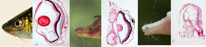 从地表到洞穴,眼睛的变化(右边为眼部石蜡切片图)(蒋万胜 供图)
