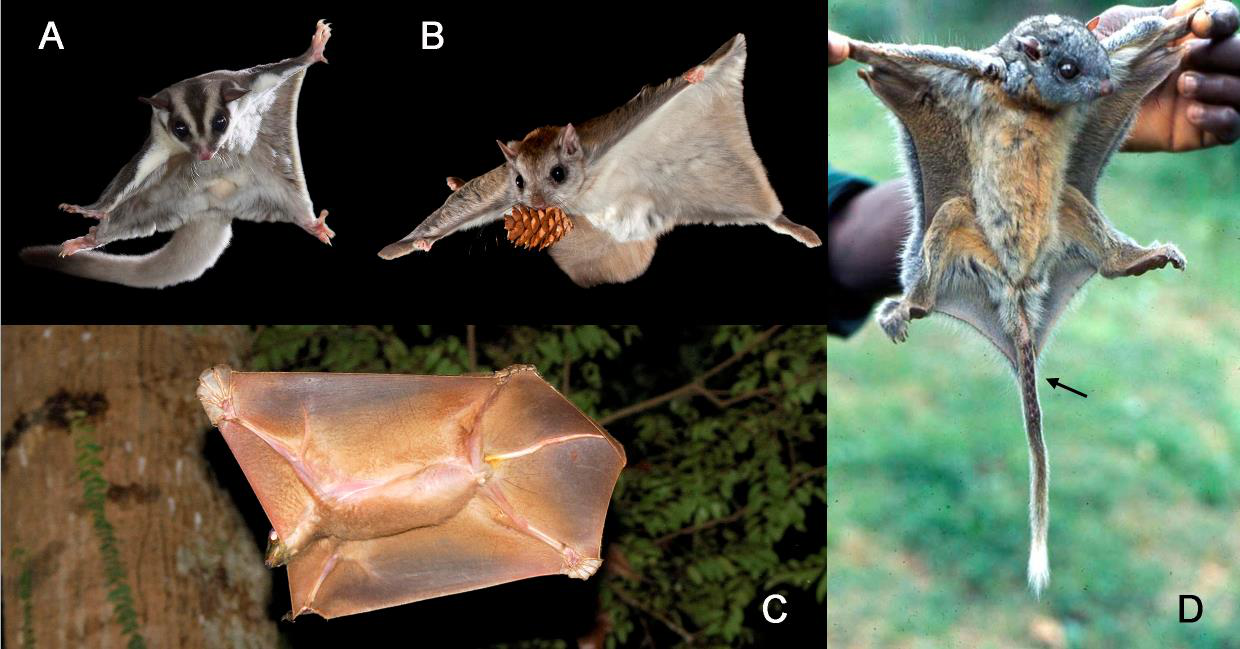 图1四类滑翔哺乳动物:A滑翔有袋类,B鼯鼠,C鼯猴,D鳞尾松鼠(箭头示尾部鳞片)。来源:A Joe McDonald, B ALEXANDER V. BADYAEV, C chevans9, D Kika Lexova。