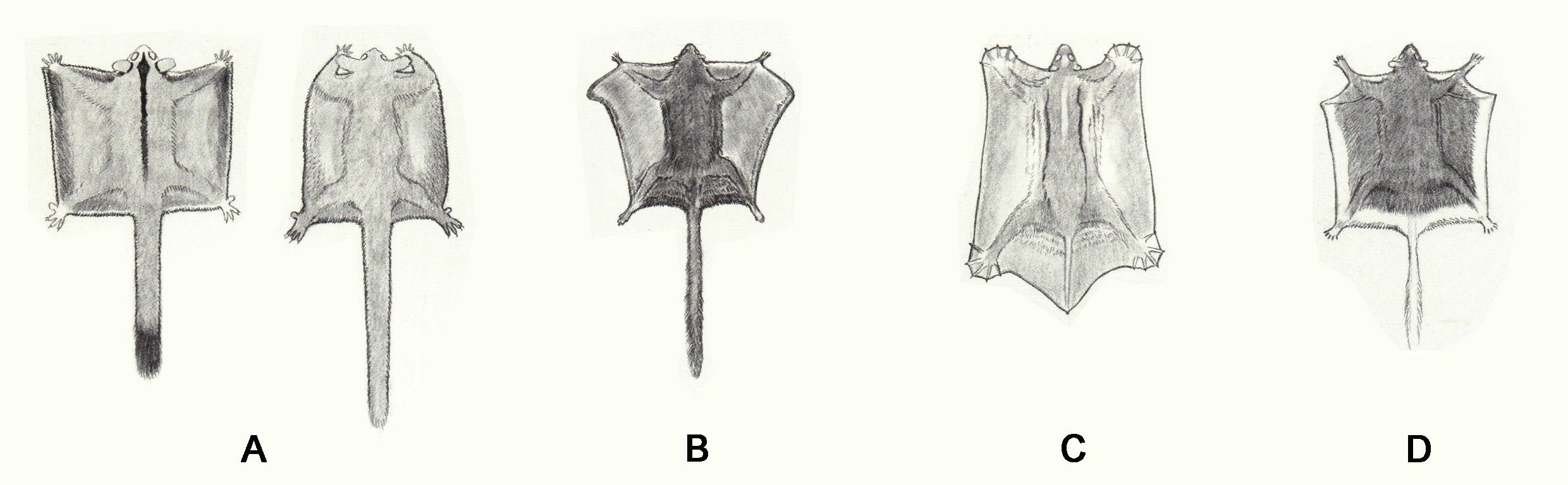 其实,这四个动物分别进化自非常不同的祖先:A是主要分布于大洋洲的滑翔有袋类(Gliding Marsupials);B是广泛分布于欧亚大陆和北美森林地带的鼯鼠(Flying Squirrels); C是东南亚特有的鼯猴(Colugos);D是非洲中西部特有的鳞尾松鼠(Scaly-tailed Flying Squirrels)。