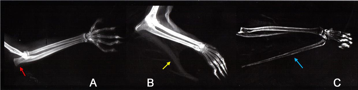第二个为滑翔而生的结构是翼尖,就是手臂外侧向外进一步伸出一个附属结构。从这个特征可以看出几类滑翔哺乳动物的区别,同时也是它们来自不同祖先的证据:鼯猴没有翼尖结构(图2C);大部分滑翔有袋类也没有(图2A左),但其中一种大袋鼯(Petauroides volans)齿骨的鹰嘴突(肘关节外侧)延长并附生一个小的软骨刺(图2A右,图3A);鳞尾松鼠也是在齿骨的鹰嘴突向外伸出一根大的钩状软骨(图2D,图3B);鼯鼠则是在腕关节外侧伸出一根大的柱状软骨(图2B,图3C)。