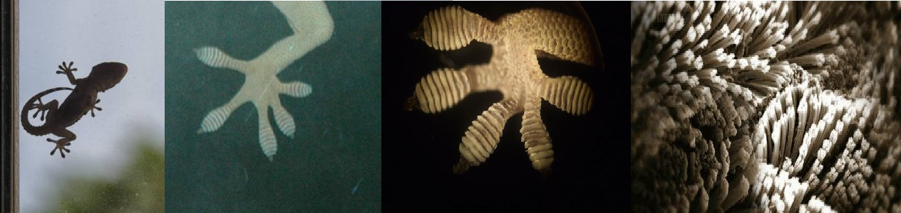 壁虎之所以能把吸盘发挥到极致,源于壁虎吸盘的结构。其实壁虎的吸盘和多数常见的吸盘的结构和原理是不一样的,多数常见的吸盘是靠气压和水压等吸附的;壁虎的吸盘是靠分子引力吸附的,壁虎的吸盘是由数百万根极细的刚毛组成的,而每根刚毛末端又有成百上千根更细的分支,这种精细结构使得刚毛与物体表面分子间的距离非常近,从而产生分子引力,虽然每根刚毛产生的力量微不足道,但累积起来就很可观,所以壁虎几乎可以在任何物体表面行走。