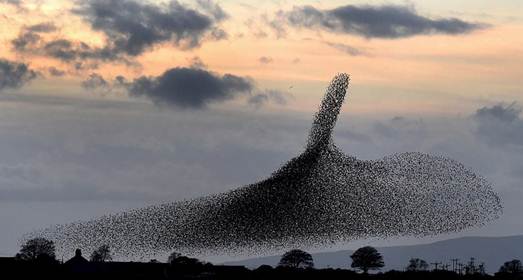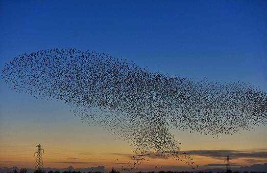 意大利科学家站在罗马博物馆楼顶,对入冬之后,每天傍晚在罗马上空肆意狂舞的欧洲椋鸟(European starlings, Sturnus vulgaris)进行录像分析,重现3D模型,最终得以揭秘。谜底可能令你大吃一惊,群鸟们履行着一条非常简单的原则:彼此只看周围大约6只同伴的行为,只要和它们保持一致就行。于是,我们看到,罗马上空的欧洲椋鸟,像巨大的礼花爆炸,在空中绽放,却彼此牢固地粘在一起。随即又像一朵游动的云,飘到其他地方,继续绽放……