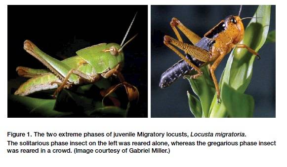 图7 蝗虫的体色,左侧是单独喂养的蝗虫,体为绿色,性情温顺。右侧是在拥挤状况下饲养的蝗虫,体色发生了变化,性情开始暴躁(引自文献图片)。
