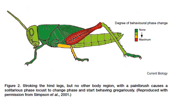 如果是碰撞促使蝗虫发怒,那么,它们身体哪一部分负责感受拥挤,从而诱发愤怒呢?用画笔或锯齿刷轻轻刮刷蝗虫身体的各个部位,一分钟刷一次,持续四个小时。最后人们发现,当刷子持续刷蝗虫的后腿,它们变得异常焦躁。而刷其他部位时,它们一般会后退,躲到一边。说明,蝗虫的后腿是它们魔鬼变身的开关之一。