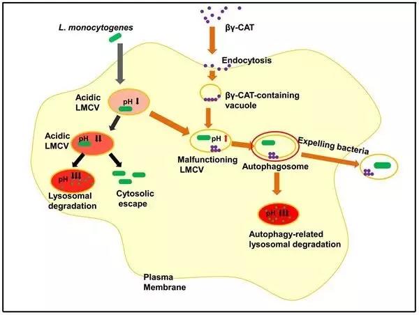 E乐彩生物毒素与人类疾病课题组的张云研究员及其团队针对这一重要的科学问题,以我国西南部高山区常见的两栖动物大蹼铃蟾为研究对象,揭示了脊椎动物对抗胞内细菌感染的新策略与新武器。通过研究大蹼铃蟾,发现了脊椎动物第一个新型孔道形成蛋白和三叶因子复合物(βγ-CAT)。令人吃惊的是,大蹼铃蟾身上的这种孔道形成蛋白同病原微生物用来进攻宿主细胞的孔道毒素非常类似,它们都能作用于生命有机体所必须的膜系统。 βγ-CAT 存在于大蹼铃蟾的皮肤、消化道系统以及免疫系统的多种细胞中,它就像哨兵一样,当有病原微生物入侵时, βγ-CAT 通过在细胞膜或者是胞内囊泡膜上形成非常特殊的小孔道(约2 nm 左右),提醒宿主细胞及时采取相应的反击手段消灭入侵的敌人。除了发挥哨兵作用外, βγ-CAT 还是宿主细胞重要的攻击型武器。大部分的胞内病原微生物都需要宿主细胞的胞内囊泡酸化环境来激活其毒力因子, βγ-CAT 通过选择性地调控细胞内囊泡酸化环境,可以有效失活胞内病菌李斯特菌的毒力因子,限制其逃逸出胞内囊泡,促进宿主细胞消化杀灭入侵的李斯特菌,并同时激发细胞外排功能把入侵的胞内病原体赶出去,最终有效地保护宿主。