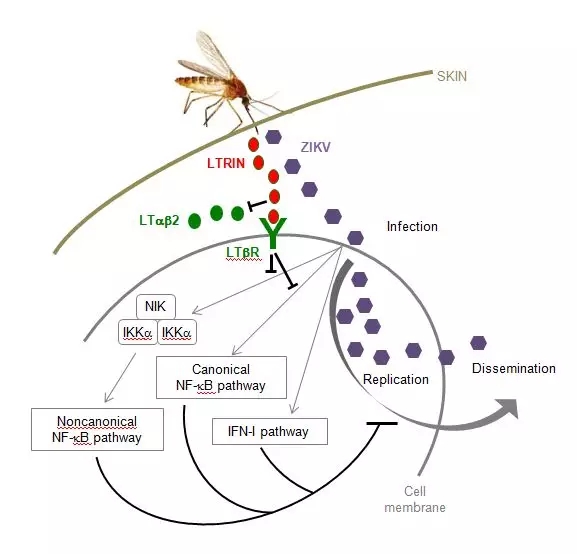 赖仞、靳林等科学家的研究发现,埃及伊蚊吸血时,唾液中的 LTRIN 会变多。LTRIN 就是专门负责堵路的,负责把淋巴毒素 β 受体的信号通路给堵了,让宿主吸血部位的免疫力低下,从而帮助寨卡“小恶魔”逃过免疫关卡,打通了 ZIKV 四处“流窜作案”的道路。