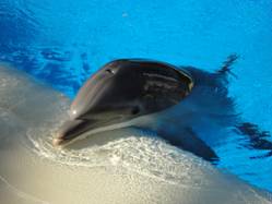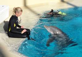 海豚在碧蓝的水里欢快地游动,不时发出一串串细厉的声音,仿佛叹息,也仿佛是哨音。训练海豚的人,口吹哨子,用短促的哨音命令海豚“起跳”或“过来”。人与海豚的交流就是靠哨音。