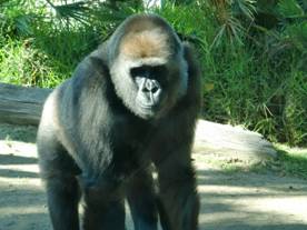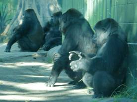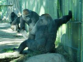 圣地亚哥动物园,千辛万苦找到大猩猩的时候,却见它们正一溜小跑,赶往某处。我也连忙在巨大的玻璃墙外跟着跑,它们一直跑到一个僻静的角落。近10只大猩猩,安静下来,或坐或轻微走动,集中在墙角。有的背靠墙,伸直腿,用手惬意地握住脚指头,扭头看玻璃墙外的观众;有的蜷起脚,蹲坐着,同时用手威严地杵着地。它们的脊背挺得非常直。这时,有的大猩猩不时走到墙的一边,不耐烦地用手推一扇窗,间或拍打几下,这些大猩猩看起来年轻些,也许是小朋友。其它大猩猩不予理睬,但时不时过来瞄一下。有的大猩猩干脆面对小窗而坐。那窗不仔细看根本看不出来,因为整面墙都画满绿茵茵的竹子,一派茂密森林景象。一米小窗就悄然凹陷在茂密竹林中。要不是年轻的大猩猩总是用手拍打,根本发现不了。有时,大猩猩直立站起来,用一只手杵在窗沿上,另一只手插在腰上,活像一个倚靠墙壁小憩的人。