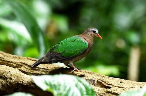 鉴别特征:羽色艳丽的小型鸠鸽类,全长约24厘米。雄鸟前额和眉纹白色,头顶、后颈蓝灰色,头侧、颈和胸红褐色;上背及两翅覆羽翠绿色闪金属光泽,肩部小覆羽为白色斑块;下背和腰黑色,具两道近白色横斑;尾上覆羽和尾羽蓝灰色具暗色端斑;胸部紫褐,腹部灰棕;嘴和脚红色。雌鸟无白色眉纹,体色较暗。